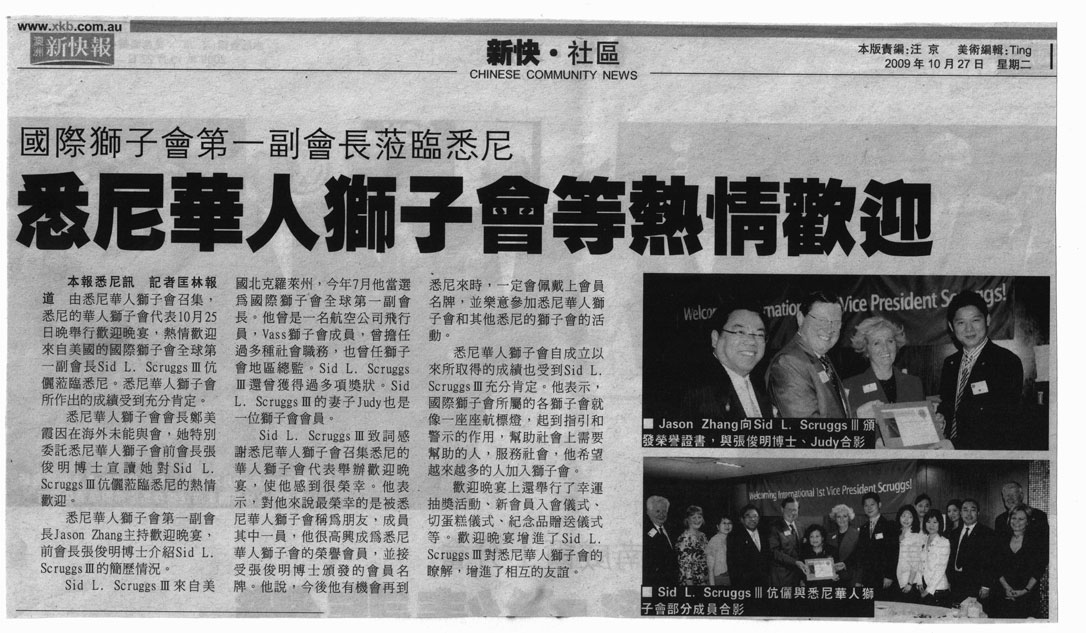 雪梨華人獅子會增國際成員國際獅子會第一副會長獲邀加盟 (星島日報)